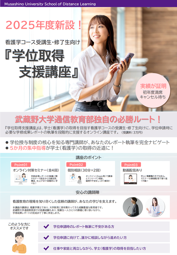 - 看護学コースは、科目等履修生として看護学の学位申請に必要な単位を積み上げるコースのため、看護学コースを修了しても、本学を卒業したことにはなりません。