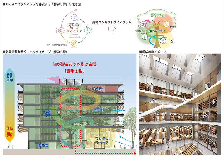 吹き抜けを中心に広がる「響学の樹」は、学びのスパイラルを象徴し、大学全体の知的交流を促進します。