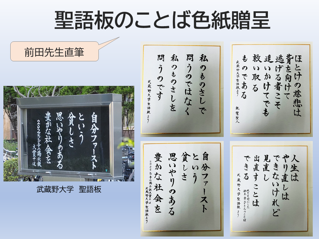 武蔵野キャンパスには毎月言葉が変わる「聖語板」が掲示されていますが、実はあの達筆な文字は、前田先生ご自身が毎月書かれているもの。今回は特別に、今年度の聖語を前田先生が色紙に書き下ろしてくださり、これが見事に当選したテーブルには、ひときわ大きな拍手と歓声が送られました。