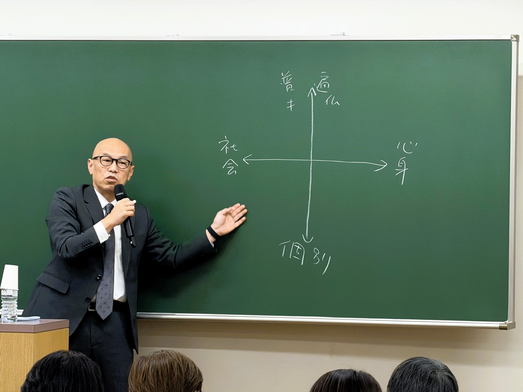 前半は、釈総長による講演「“思い通りにならない”と向き合う」からスタートしました。釈総長は、現代人が抱える「生きづらさ」への処方箋として、自身の中に多様な人格(子ども、高齢者、怒る自分など)が同居する「アパートモデル」という考え方を紹介 。「たった一つのアイデンティティに固執するからつまずく。自分の中の多様な顔を排除せず成熟させていくことが、苦しみと向き合う手がかりになる」と語りかけました 。