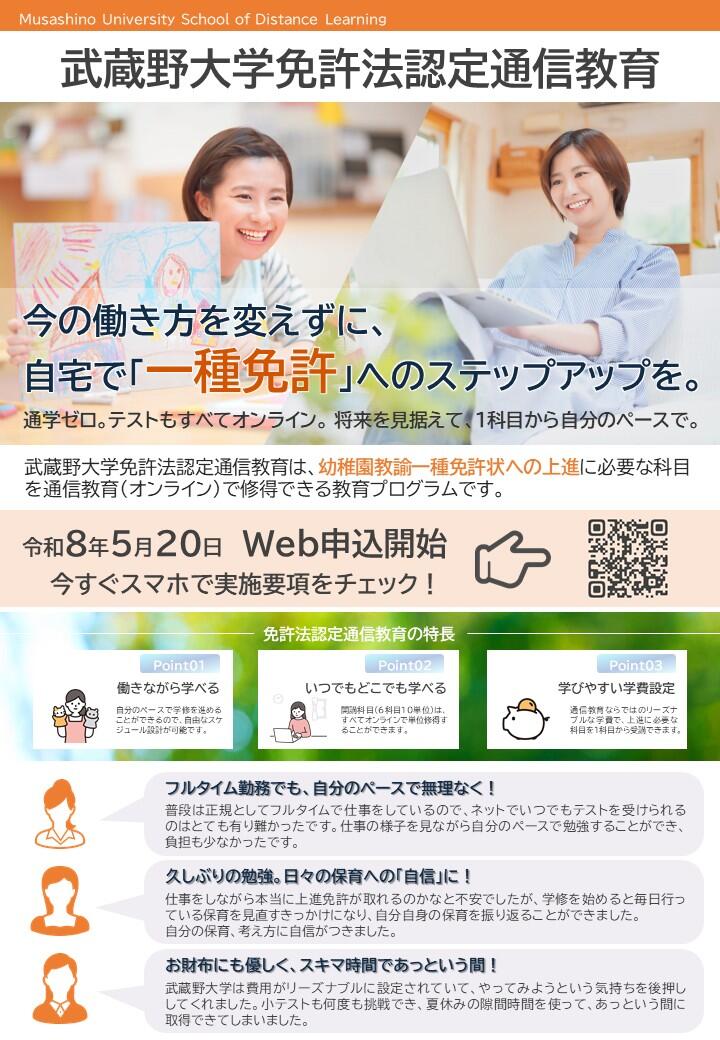 武蔵野大学通信教育部では、本日、令和8年度「武蔵野大学免許法認定通信教育(幼稚園教諭一種免許状)」の申込手順・詳細ページを公開いたしました。